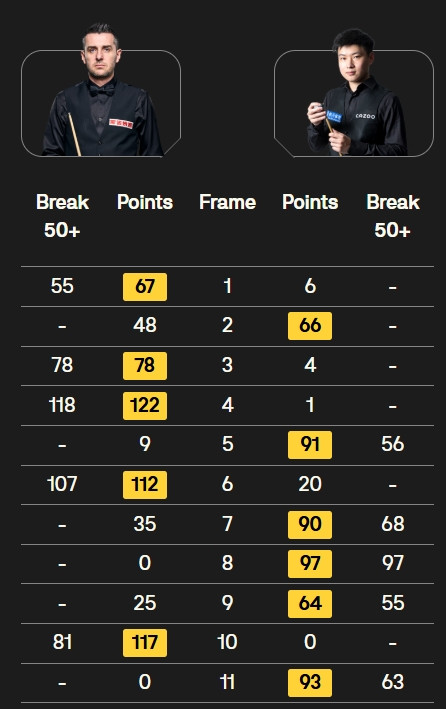 全场比赛,赵心童打出五杆50+(56、68、97、55、63),马克·塞尔比打出两杆破百(118、107)和三杆50+(55、78、81)