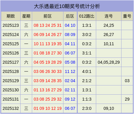 后区分析:上期开出后区06、07,最近10期的后区奇偶比为8:12,本期关注【偶奇】数后区,看好后区号码:08、11。