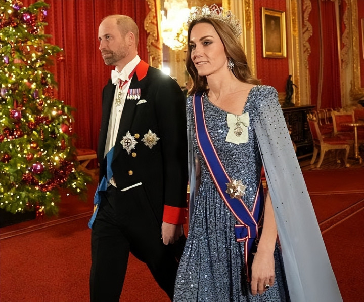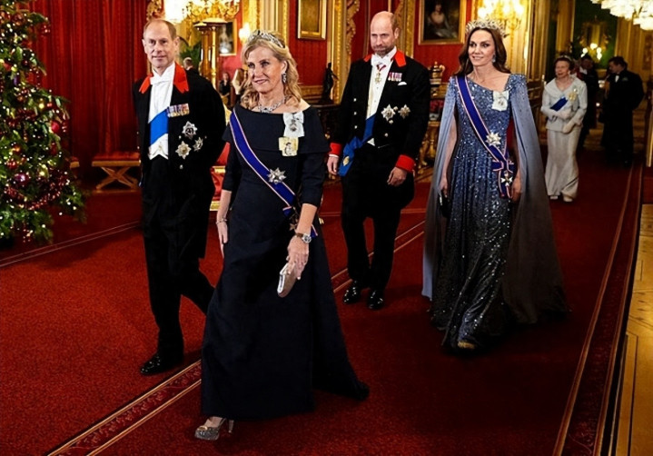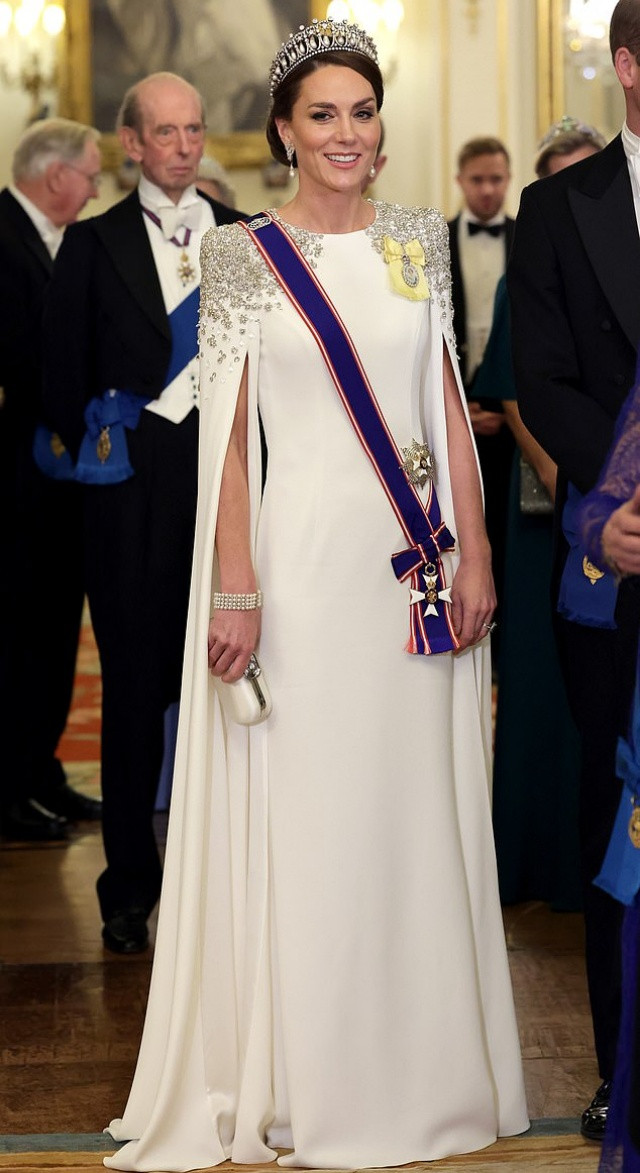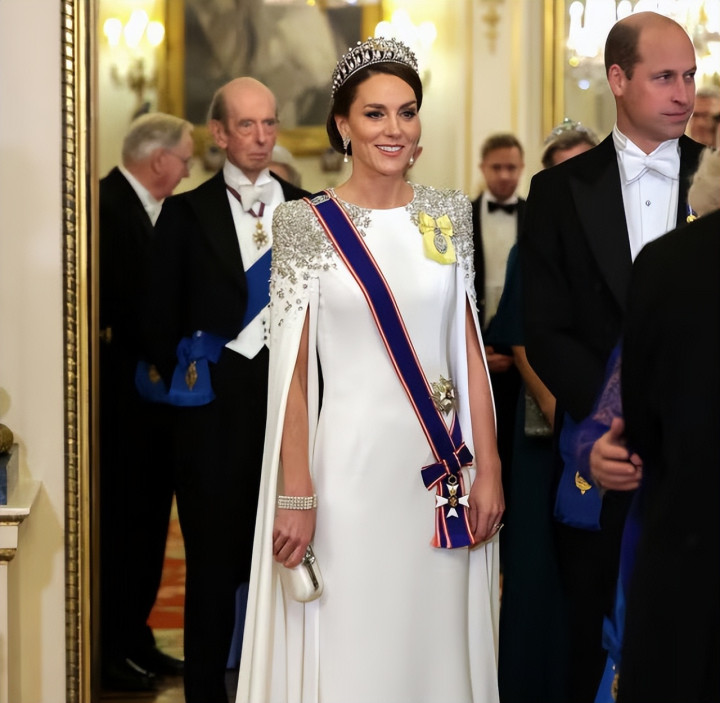 凯特身着她钟爱的珍妮·帕克汉品牌白色宝石装饰礼服盛装亮相,与威廉王子、查尔斯三世国王及卡米拉王后共同出席南非总统西里尔·拉马福萨的欢迎晚宴。
