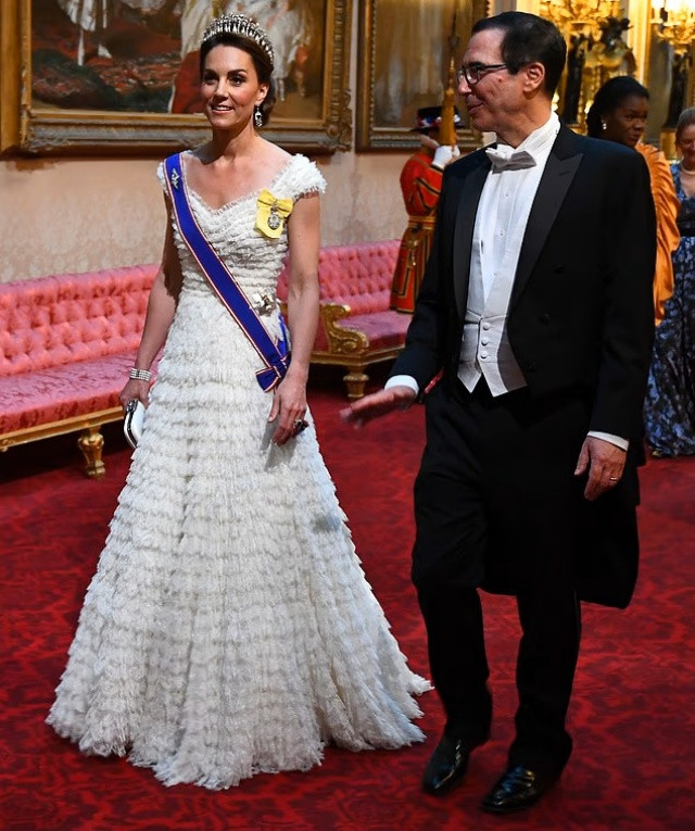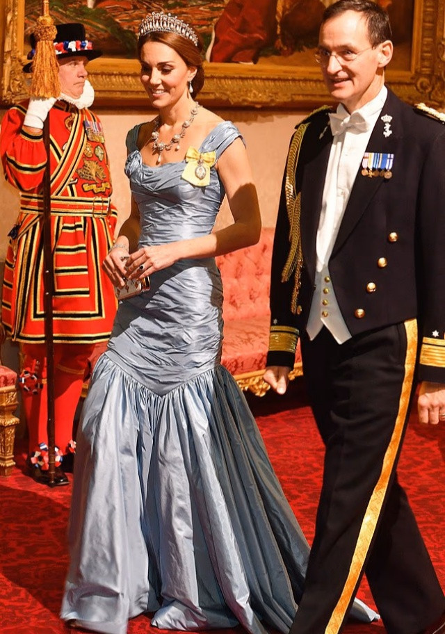 凯特第三次参加国宴是在2018年,为荷兰国王威廉-亚历山大和王后马克西玛举行的欢迎宴会上,王妃选择了一件淡蓝色Alexander McQueen真丝礼服,搭配褶皱紧身上衣和她最爱的"情人结"钻石头饰出席活动。