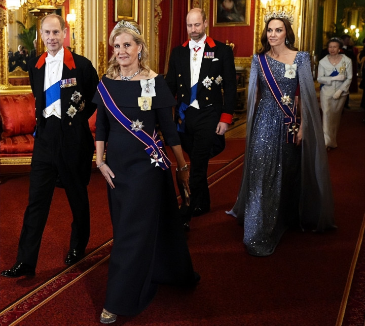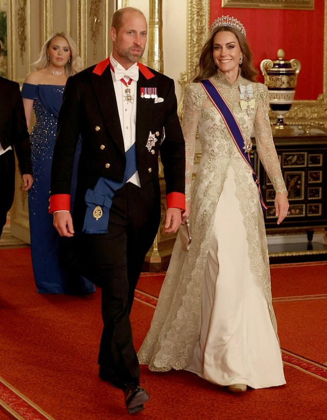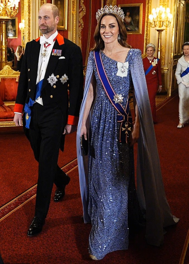 2025年9月的国宴上,凯特身着菲利帕·莱普利礼服裙,佩戴其标志性的情人结冠冕。蕾丝罩衫与高领设计相得益彰,整体造型既彰显王室威仪又不失迷人魅力。