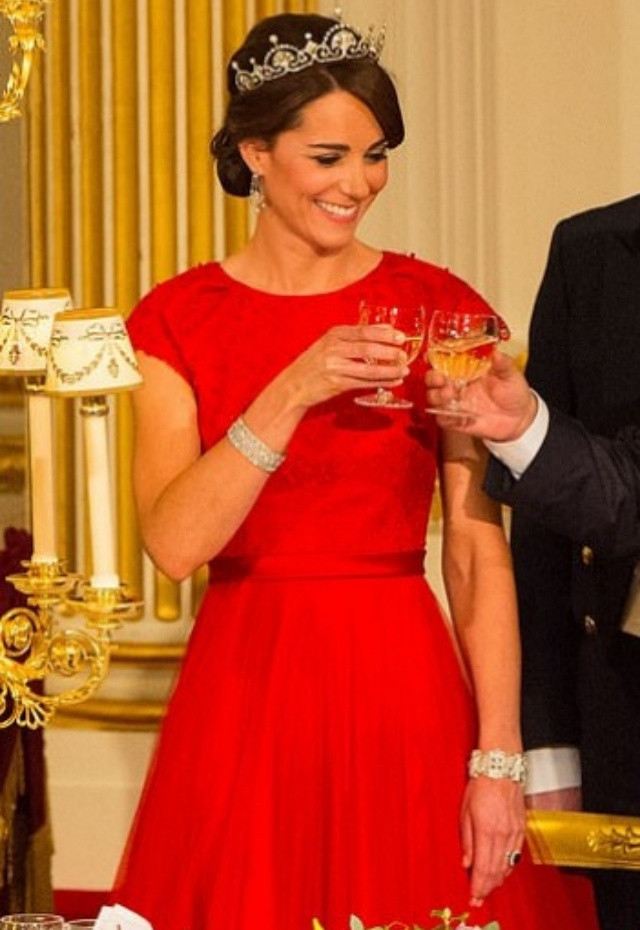 这次的状态,凯特与2015年10月参加首次国宴时那个"紧张不安"的王妃判若两人。为这一场合,当时凯特选择了一件定制的珍妮·帕克汉姆礼服——带帽袖——颜色为中国国旗色。她搭配了精致的珍珠钻石莲花头饰。