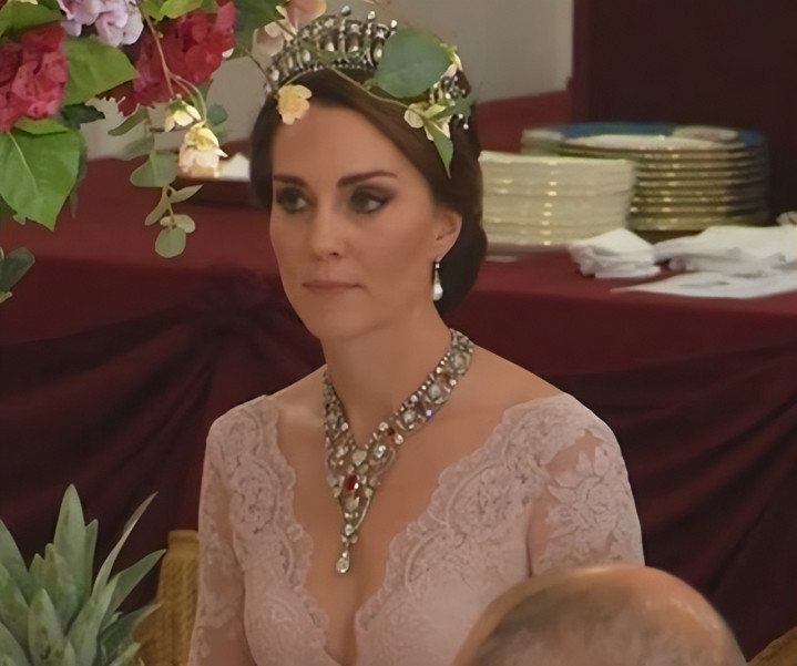 令人瞩目的是,凯特佩戴了维多利亚女王的东方头冠头饰,这是一件极为珍贵的珠宝。东方头冠不仅仅是一件装饰品,更是象征着王室的历史与权威,尤其是如此稀有的历史珠宝更增添了场合的庄重感。