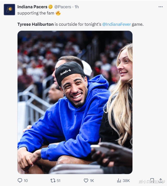 北京时间8月27日,印第安纳步行者队官方晒出球队核心泰雷斯-哈利伯顿坐在场边观战印第安纳狂热队比赛的图,并写道:支持家庭。