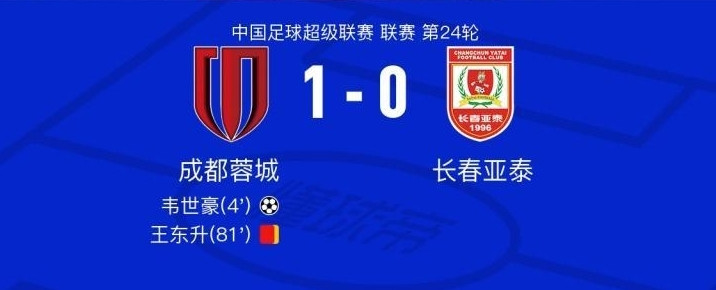 全场比赛结束,上半场韦世豪任意球低射破门,赵英杰远射造险,韦世豪伤退。下半场胡荷韬头球差点破门,罗慕洛远射擦柱而出,王东升两黄变一红被罚下。最终成都蓉城主场1-0小胜长春亚泰取得三连胜。