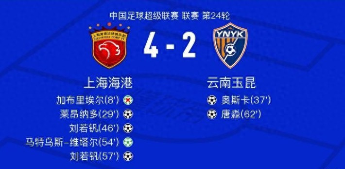 全场比赛结束,上半场刘若钒造点,加布里埃尔丢点,刘若钒助攻莱昂纳多破门,侯永永助攻奥斯卡扳平。下半场刘若钒两次补射破门,维塔尔点射建功,唐淼凌空斩,最终上海海港主场4-2战胜云南玉昆终结两轮不胜。