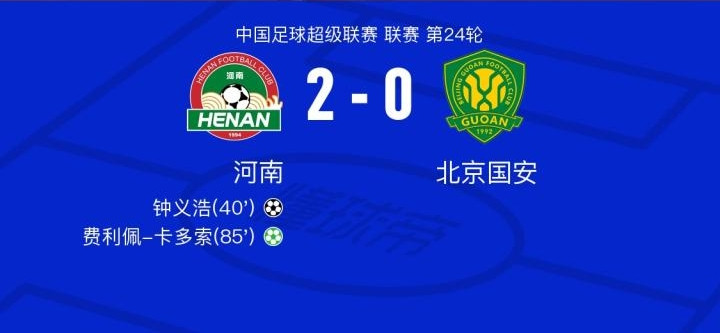 全场比赛结束,上半场曹永竞凌空射门击中横梁,法比奥错失机会,钟义浩错失机会后补射破门。下半场张玉宁击中立柱,卡多索点射锁定胜局。最终河南俱乐部酒祖杜康主场2-0战胜北京国安,国安遭遇两连败。