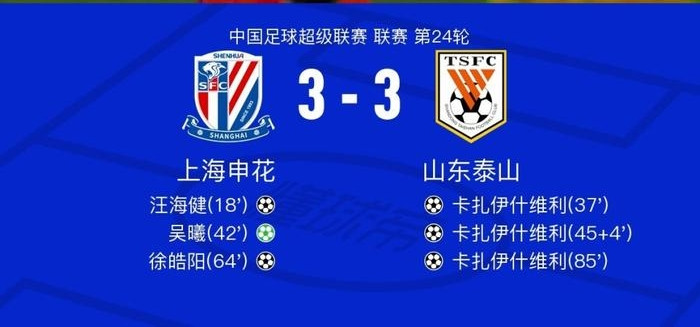 全场比赛结束,上半场汪海健角球直接转入球门,瓦科推射扳平,王大雷扑倒刘诚宇送点,吴曦主罚命中,瓦科补时双响。下半场蒋圣龙吃到黄牌,徐皓阳头球破门,瓦科帽子戏法。最终山东泰山客场3-3战平上海申花。