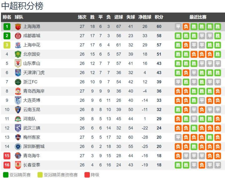 中超最新积分情况,争冠三队27轮战罢之后,上海海港积60分排名第一,成都蓉城积58分排名第二,上海申花积57分排名第三,三队咬得很紧,就存在一场球的差距,因此中超本赛季争冠情况还是非常复杂的,因为上海海港下轮就要迎来争冠关键战。